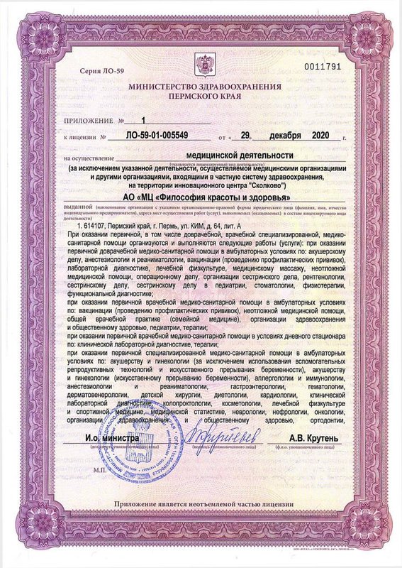 Медицинский центр Философия красоты и здоровья - это многопрофильное медицинское учреждение, предлагающее индивидуальный комплекс процедур и услуг для каждого клиента. В работе клиники все построено с учетом комфортного пребывания посетителей. Новейшее оборудование центра помогает провести диагностику организма пациента для составления плана лечения и профилактики. В клинике функционируют отделения анестезиологии, психиатрии, общей терапии, кардиологии, ревматологии, гастроэнтерологии, гепатологии, пульмонологии, аллергологии, иммунологии, нефрологии, гематологии, неврологии, эндокринологии, дерматологии, венерологии, урологии, андрологии, колопроктологии, гинекологии, акушерства, маммологии, онкологии, психотерапии, наркологии, офтальмологии, оториноларингологии, педиатрии, неонатологии, логопедии, ортопедии. Наши специалисты имеют высокую квалификацию и внимательно отнесутся к каждой вашей просьбе. Доверяя заботу о своем здоровье нам, вы можете не сомневаться в положительном результате. Также мы поможем с выбором подходящей диеты и коррекцией веса.